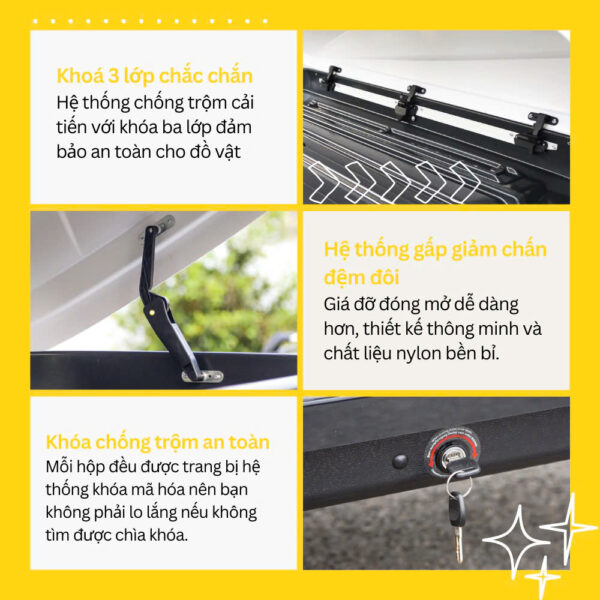 Cốp nóc được trang bị nắp đậy kín đáo cùng hệ thống khóa chống trộm. Nhờ đó, bạn có thể yên tâm rằng những vật dụng bên trong luôn được bảo vệ an toàn trước mọi tác động của thời tiết và nguy cơ bị đánh cắp.