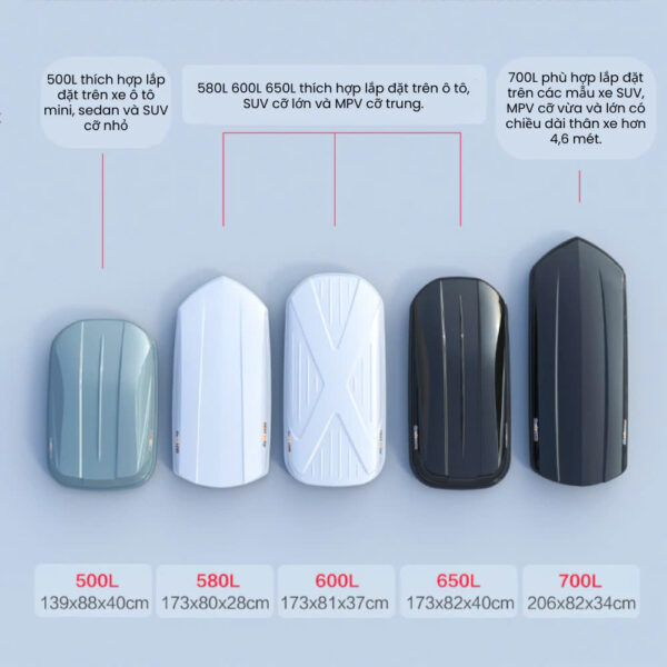 Tùy theo nhu cầu sử dụng, bạn có thể lựa chọn các mẫu cốp nóc phi thuyền với dung tích đa dạng từ 500L đến 700L. Nhờ đó, bạn sẽ có thêm không gian rộng rãi để chứa hành lý, đồ đạc cần thiết mà không làm ảnh hưởng đến sự thoải mái của hành khách ngồi trong xe.