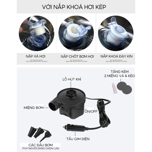 • Một bộ sản phẩm gồm: 1 thân đệm bao gồm cả chân, 2 gối, bộ bơm điện, túi đựng, miếng vá dự phòng.