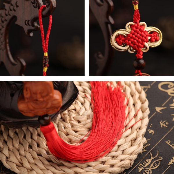 - Màu gỗ của tượng kết hợp với màu đỏ của những sợi dây tạo điểm nhấn hoàn hảo cho không gian xế hộp. Đồng thời vì là tổ hợp màu có tính dương nên càng làm gia tăng vận khí, đem lại sự may mắn cho gia chủ.